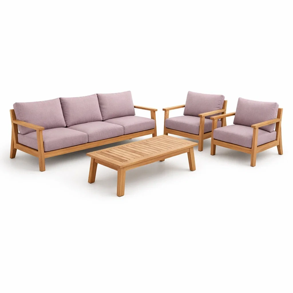 Garten sofa set teakholz mit polyesterbezug lavendel 4 teilig